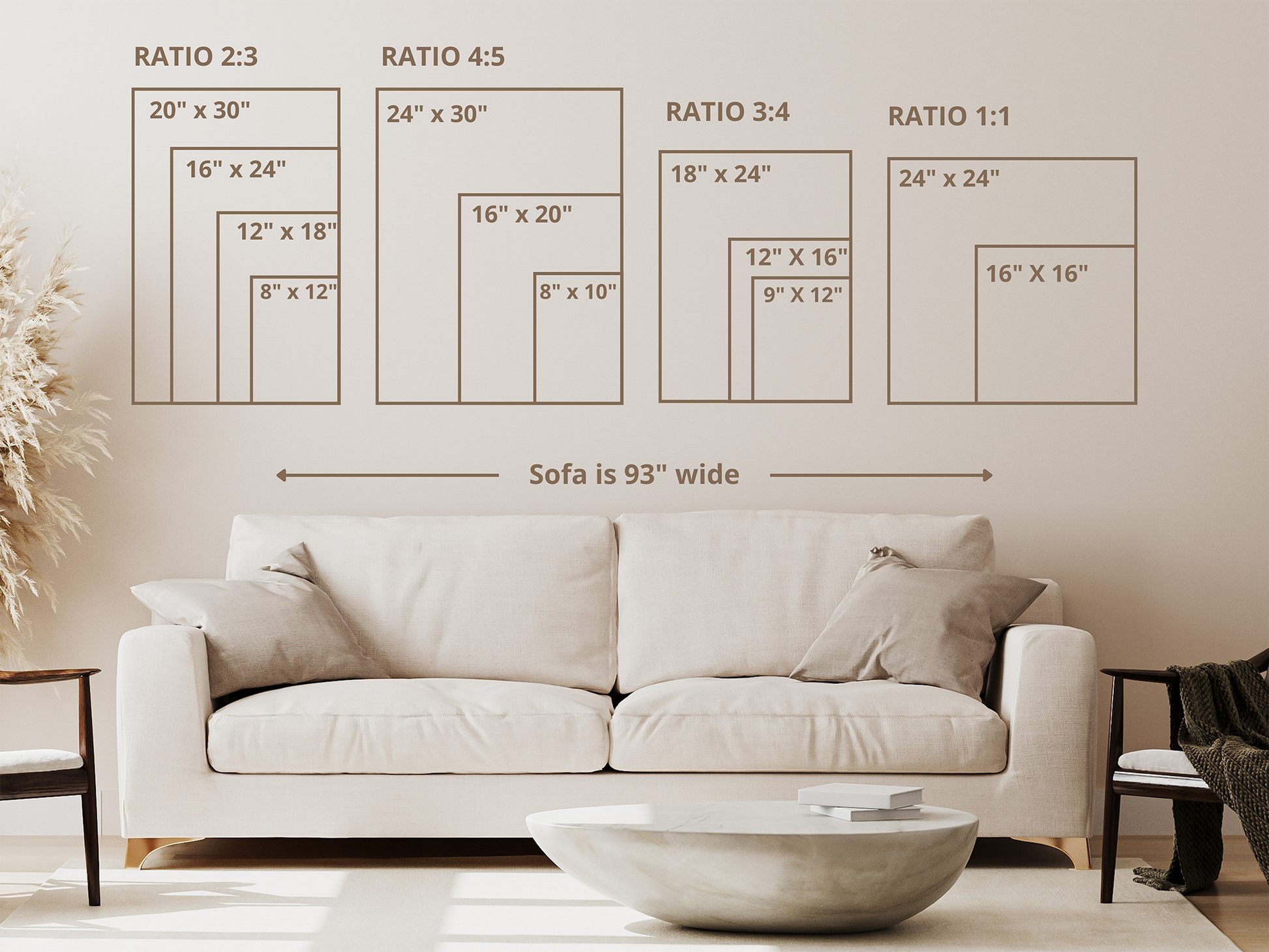(Example for a 12x16, art showing is 7.5"x11.4", Matt is 12"x16", Frame is an additional .75in around, total frame measures 12.75" x 16.75"